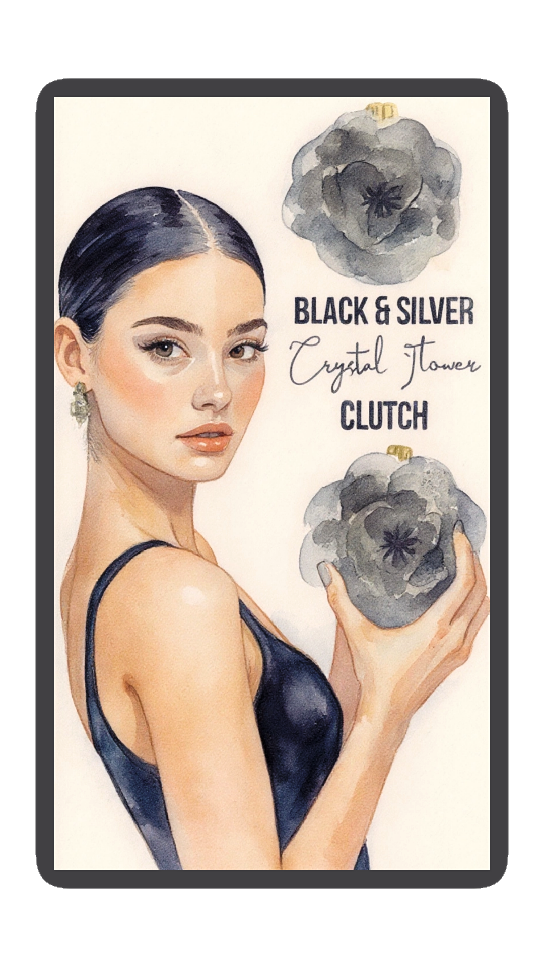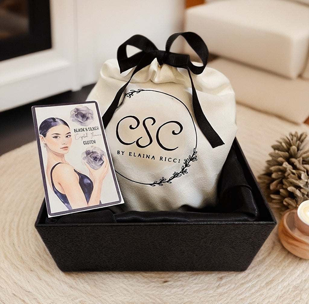 Black and Silver Flower Clutch. Hand chain, dust bag, and watercolor print gift tag included.