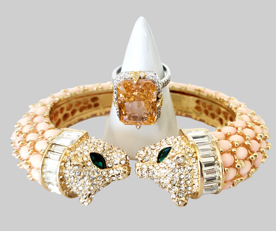 Pink Double Headed Panther Cuff and Sterling Silver Coral Diamond Ring
