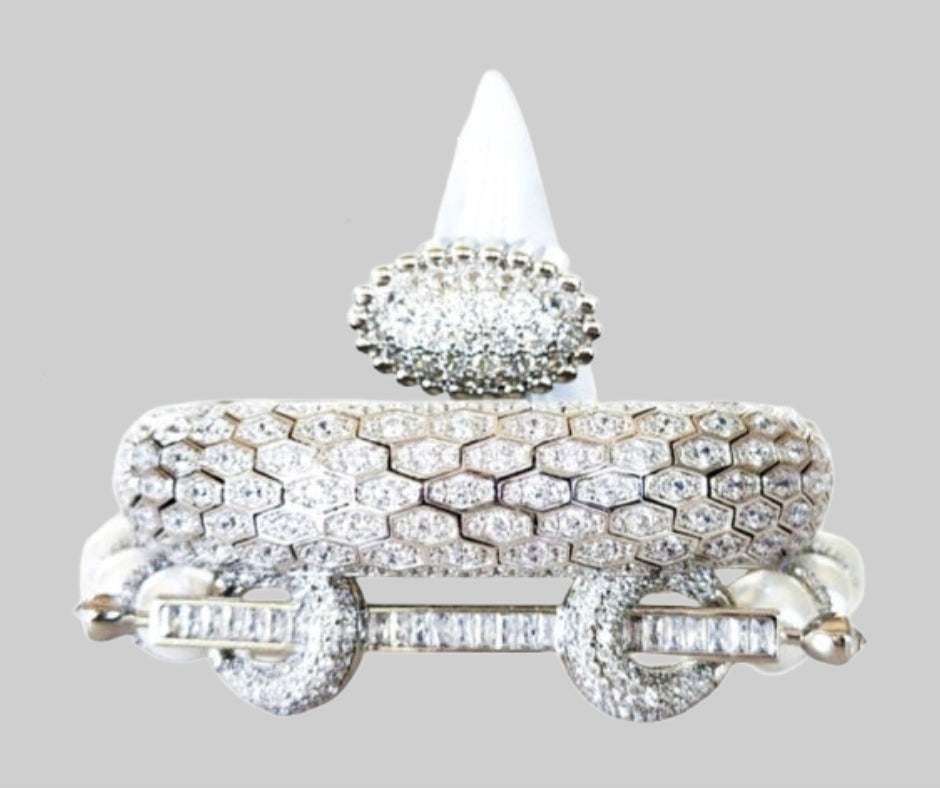 Genuine Sterling Silver 925, Oval Moissanite Diamond Ring. Genuine Sterling Silver 925, Platinum Plated Zirconia Snake Pattern Cuff Bracelet. Pearl Bracelet