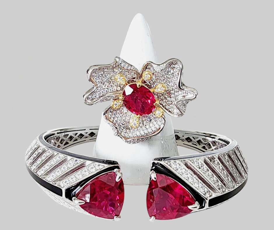 Sterling Silver Ruby Flower Ring and Cuff Bracelet
