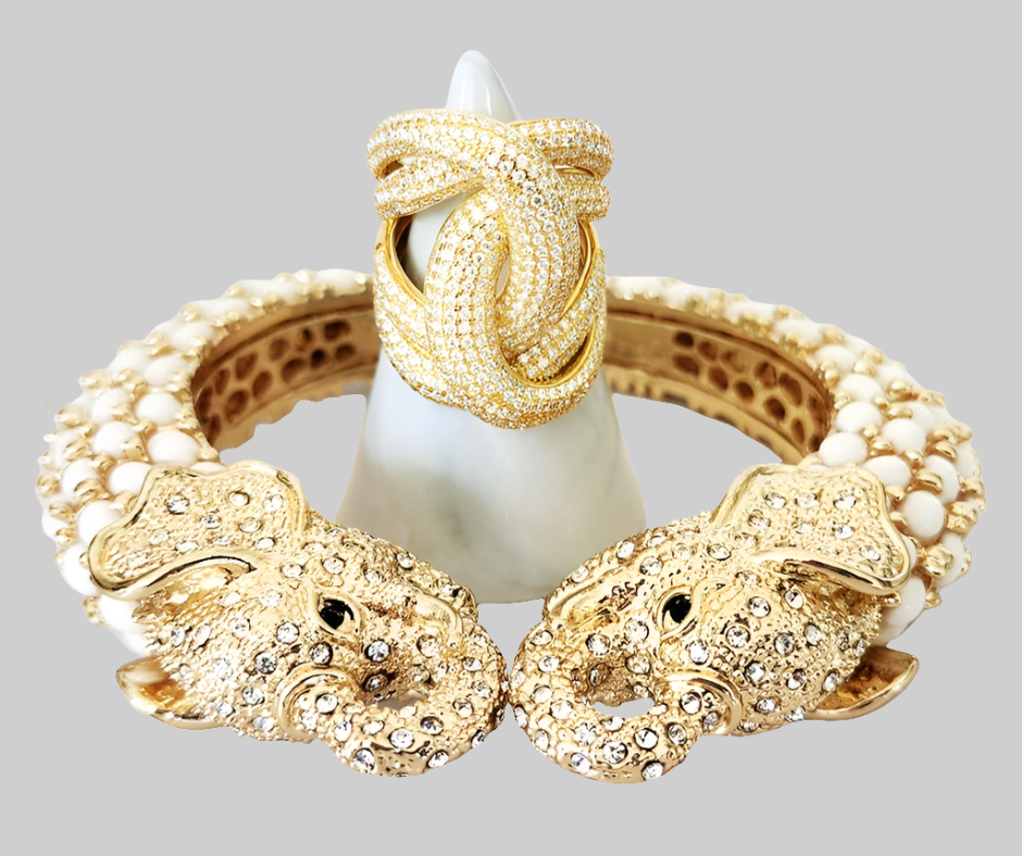 Gold and White Double Elephant Head Cuff and Sterling Silver Gold Plated Pave Diamond Twist Ring
