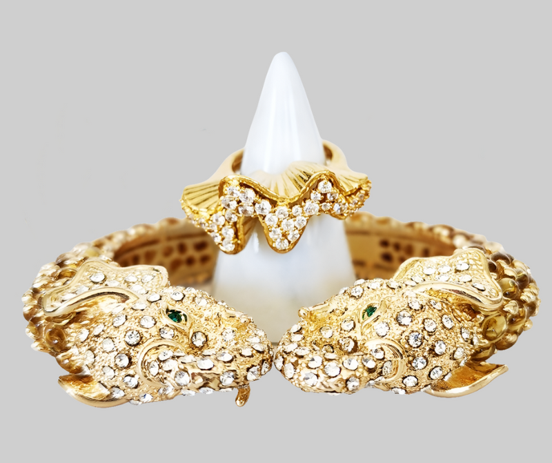 Gold and White Double Elephant Head Cuff and Sterling Silver Gold Plated Pave Diamond Twist Ring