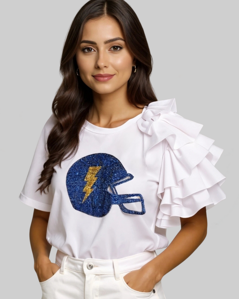 Blue and Gold Sequin Football Helmet Ruffle Sleeve Shirt